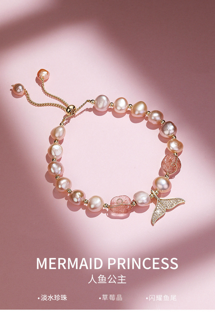 淡水珍珠手链女时尚鱼尾人鱼吊坠草莓晶手串手饰品生日礼物